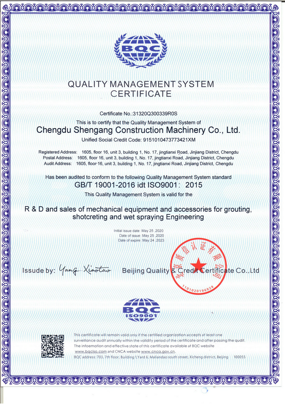 經(jīng)過(guò)國(guó)家權(quán)威機(jī)構(gòu)質(zhì)量認(rèn)證中心專(zhuān)家組的全面、嚴(yán)格、細(xì)致的指導(dǎo)和審核,確認(rèn)成都申港工程機(jī)械有限公司質(zhì)量管理體系符合GB/T19001-2016 idt ISO9001:2015標(biāo)準(zhǔn),并于2020年5月25日向我公司正式頒發(fā)了ISO9001質(zhì)量管理體系認(rèn)證。